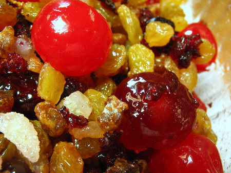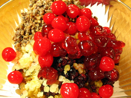 Let's start with the fruits. Remember, while it's nice to go "traditional," be sure to use the fruits that you like. You'll need 6 3/4 to 7 cups of fruit, including the cherries. For this batch, I used dried dates, candied peel, dried cranberries, golden raisins, and two types of cherries.