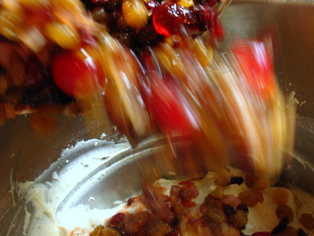 Waaahooo! Everybody into the pool! Add in your soaked fruits and any leftover soaking liquid. Stir everything together a few more times and get ready to pan it all up.