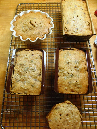 Most fruitcake lovers will make their holiday cakes in October to have them sufficiently ripened by December. For those of you with eagle eyes, you'll notice that the little brioche pan of fruitcake is missing, along with a couple of the smaller round ones.