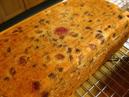 How's that for luck? I didn't place the cherry in the center of this loaf, but when I turned it out of the pan, there it was. As we do share pans here in the kitchen, I felt obliged to turn out my largest fruitcake, to free up the pan. When it's cool, I'll put it on a plate for storage. If you're using paper pans, there's no need to turn out your fruitcake.