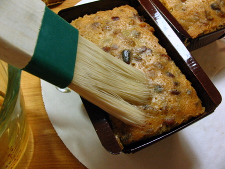 While the cakes are still warm, brush with a little extra brandy, rum, or juice. You'll want just enough to moisten the loaves, but not soak them.