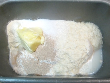 Put the ingredients for Golden Pull-Apart Butter Buns in the bucket.