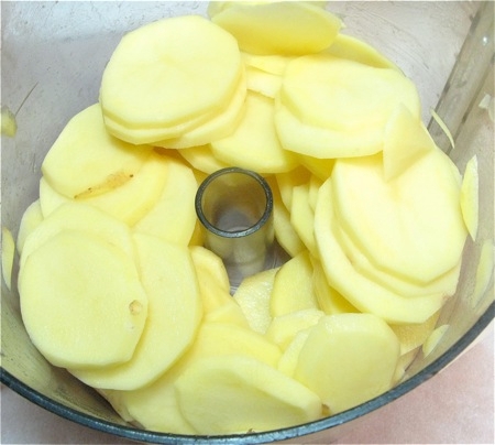 Peel the potatoes, and slice them 1/4” thick. If you have a food processor with slicing discs, the 4mm disc is perfect.
