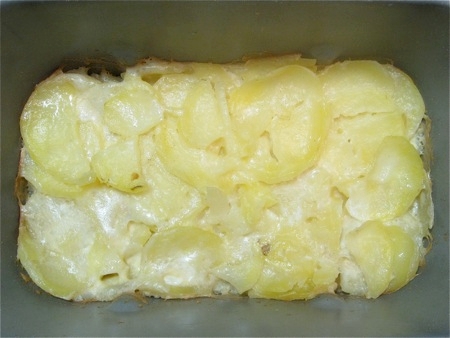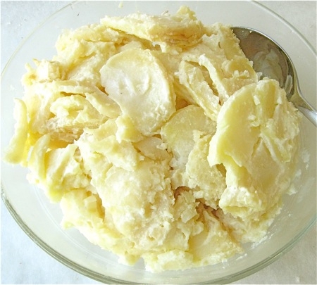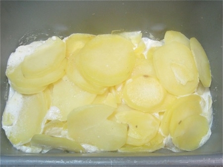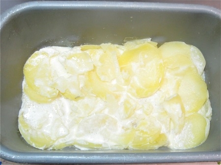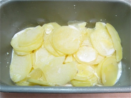 Layer 1/3 of the parboiled potatoes in the bucket. Sprinkle with some of the salt, pepper, and onion powder. Drizzle with some of the butter, then 1/3 of the hot cream.
