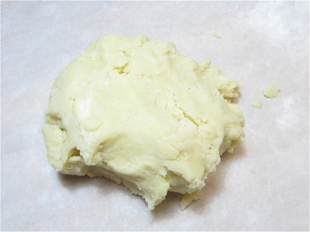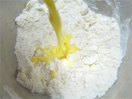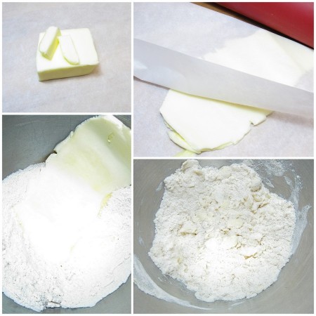 Place the cold butter on a piece of parchment or waxed paper, and flatten it with a heavy object – a rolling pin works well. Add the flattened butter to the dry ingredients, and work it in with the flat beater of your mixer (or with a pastry fork or blender, your fingers, or the tool of your choice).