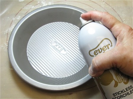 When you're ready to bake, spray a 9" pie pan with non-stick vegetable oil spray.