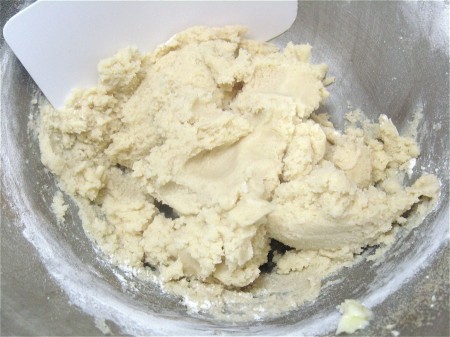 The dough will seem very dry, and won't seem to want to become cohesive at first. Just keep beating, and it'll eventually come together.