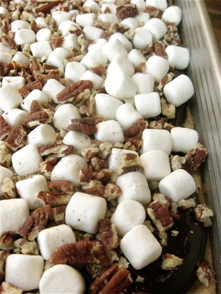 So, class, what do I name these vanilla shortbread bars topped with chocolate ganache, toasted pecans, and mini marshmallows?