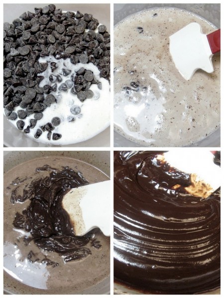 Place 3 cups (510g) chopped semisweet or dark chocolate or chocolate chips and 3/4 cup (170g) heavy cream in a microwave-safe bowl, or in a saucepan. Heat in the microwave, or over low heat on a burner, until the cream is steaming and barely beginning to form bubbles.