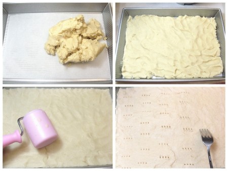 Press the dough into the prepared pan, smoothing the surface with your fingers or a mini rolling pin (pastry roller). The dough will feel stiff, but just keep pressing on it until you've covered the bottom of the pan.
