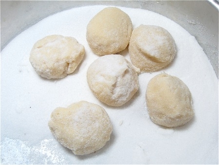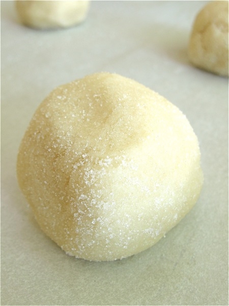 Once the balls are coated with sugar, roll each one into a round in your palms. The dough softens quickly; refrigerate it between batches.