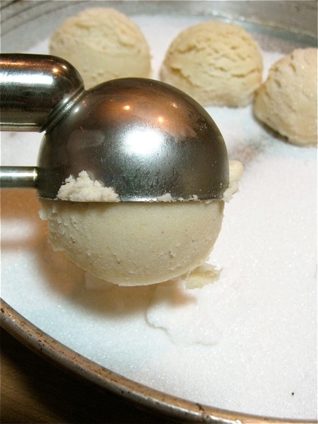 Place some granulated sugar or coarse white sparkling sugar in a shallow pan, and scoop the chilled dough by the tablespoonful into the sugar, rolling to coat. A tablespoon cookie scoop works well here.