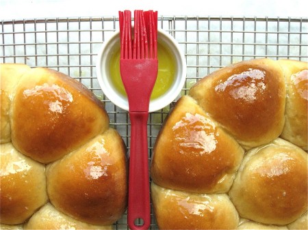 Remove the rolls from the oven, and after 2 or 3 minutes, carefully transfer them to a rack. They'll be hot and delicate, so be careful. Brush hot-from-the-oven rolls with melted butter, if desired, for a soft, buttery crust.