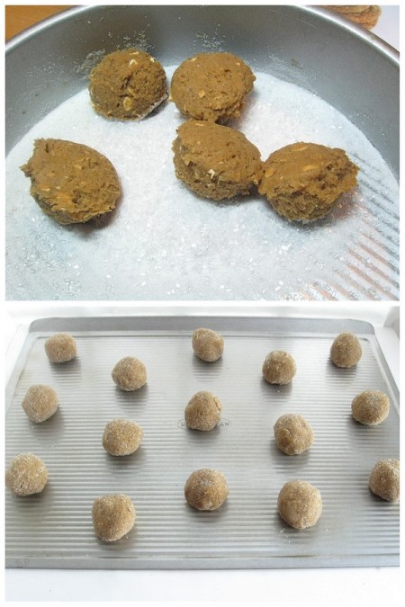 Scoop the sticky dough into 1 1/2" balls; a tablespoon cookie scoop works well here. Roll the balls in sugar (either granulated or coarse), if desired; 1/3 cup to 1/2 cup should do it. This is easily done by sprinkling the sugar into an 8" cake pan, and dropping the sticky dough into the pan. Shake the pan to coat the dough balls with sugar.