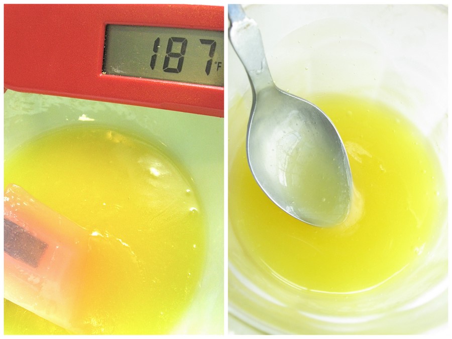 At 187°F, they were indeed sufficiently cooked. And the curd was thick enough that it didn't run right off the spoon, but kind of coated it – I guess.