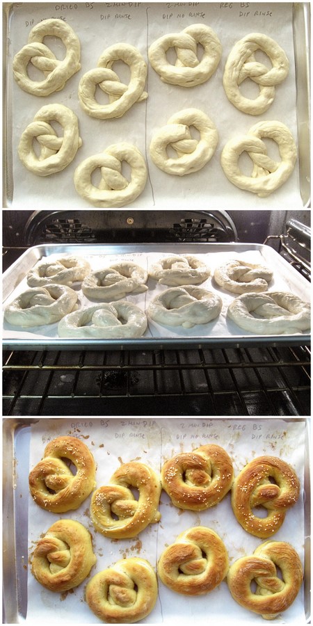 An earlier experiment was interesting, though. I was wondering if it mattered how long the pretzel spent in its baking soda bath.