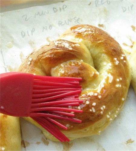 Remove the pretzels from the oven, and brush them thoroughly with the melted butter.