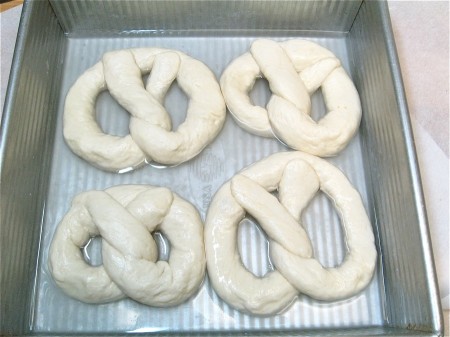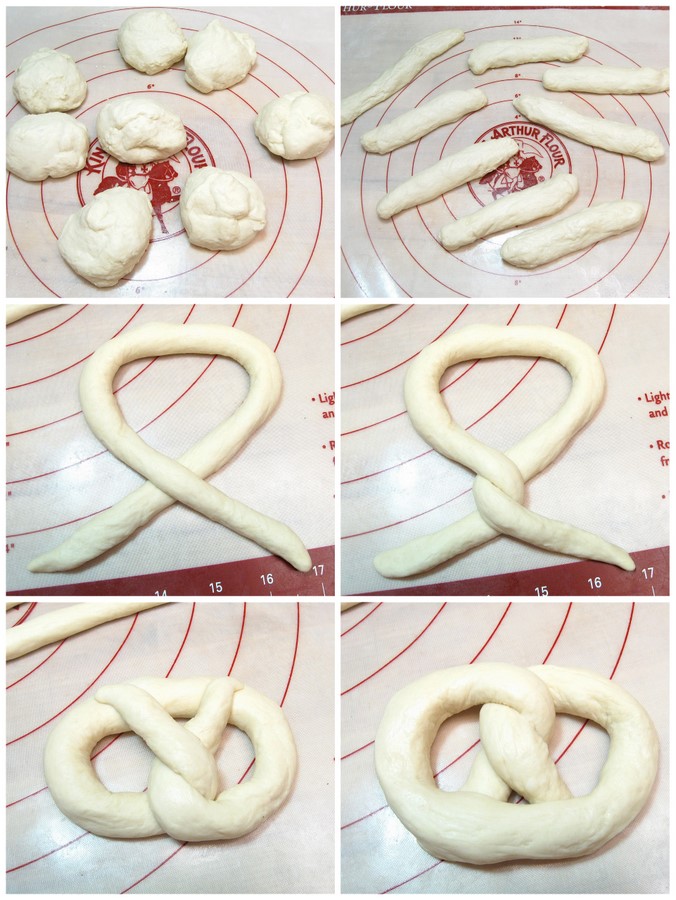 Roll each piece of dough into a long, thin rope (about 28" to 30 " long), and twist each rope into a pretzel.