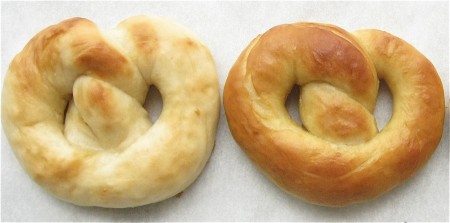 On the left, a pretzel that was dipped in its bath, then immediately transferred to a baking sheet. On the right, a pretzel that spent 2 minutes soaking in its bath.