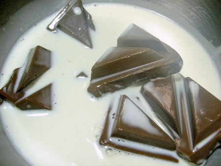 Place 12 ounces (340g) of milk chocolate in a medium-sized heatproof bowl. Heat 1 cup (227g) heavy cream to just boiling, and pour over the chocolate.