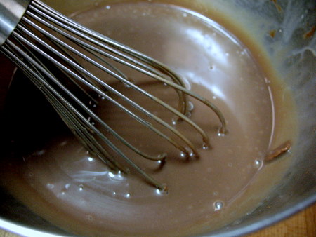 Slowly whisk the mixture together until it's smooth and lump-free. You now have milk chocolate ganache, the makings of fine truffles and fantastic frosting. Place the ganache in the fridge to chill while you make the cake.