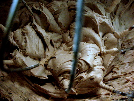 While the cakes are soaking, prepare the ganache. Your chilled ganache should be the consistency of chocolate pudding by this time. Scrape it into your mixer bowl and beat with the whisk attachment until it becomes light, fluffy, and smooth.