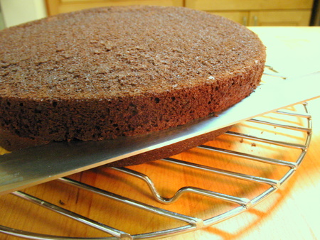 To assemble the cake, place one cake layer on the serving plate, then frost with a 1/2" layer of ganache and top with a second layer of cake.