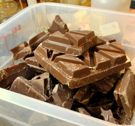 In the test kitchen pantry, everything is just a little bigger than a regular home pantry. At home, I keep about 2 pounds of milk chocolate on hand. In the test kitchen pantry, it's closer to 12 pounds. As the kids say OM, NOM, NOM. (For those of you without teenagers, it roughly translates munch, munch, munch.) You won't need 12 pounds, but you'll need about a pound and a half of top quality milk chocolate. Sorry, leave the milk chocolate chips on the shelf for this one, and treat yourself to some really good bar chocolate.