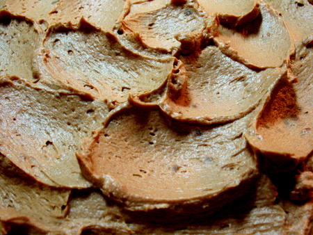Top the Fluff with a third layer of cake, then more ganache and the final layer of cake. Finish icing the cake as usual with the remaining ganache. To make the decorative waves in the icing, use the back of a very round spoon. I used a measuring spoon with a deep round bowl, and made little swishes through the soft icing, overlapping them like feathers.