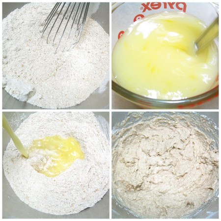 Make a well in the dry ingredients and pour in the liquids. Stir together until blended and no dry spots remain; the dough will be soft and sticky. In fact, it's probably more of a stiff batter than a soft dough.