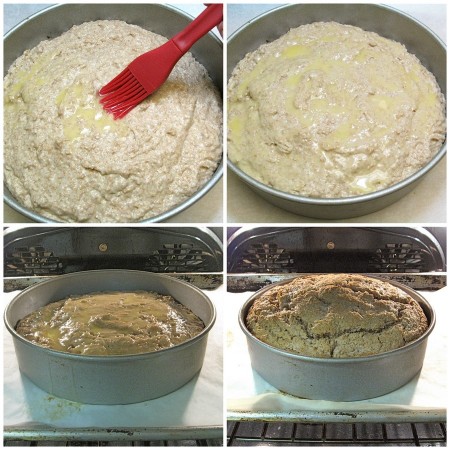 Brush the top with 1 tablespoon melted butter. Wait 5 minutes for the liquid to be absorbed by the flour before baking.