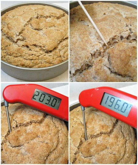 A cake tester or toothpick inserted into the center will come out clean. Also, an instant-read thermometer will read just over 200°F in the center.