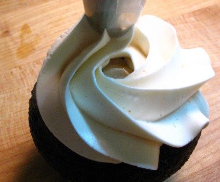 Place the coffee icing in a disposable pastry bag or a zip-top bag, and snip off a fairly large hole. Pipe the filling into the cored cupcake just even with the top.