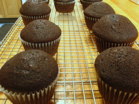 Divide the batter among 12 paper-lined wells of a cupcake or muffin pan, and bake at 350°F for 15 to 18 minutes. A cake tester will come out clean and the tops will be dry to the touch.