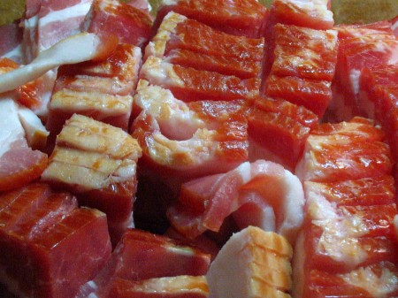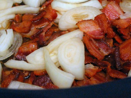 Cut 1 1/2 pounds of nice thick bacon into 1 inch pieces and cook until crisp. I like to use a skillet for cooking my bacon, but some folks like to use the oven. Any way you like is fine, you just want the bacon on the crisper side.