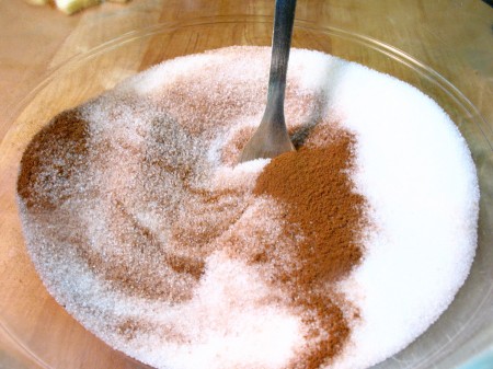Prepare the cinnamon-sugar topping. Whisk together 1 cup sugar and 1 teaspoon cinnamon. Taste a little on your fingertip and adjust the cinnamon to your liking. If you're a sweet/salty person, a pinch of fine sea salt could be added to the mix.
