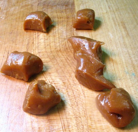 Using kitchen scissors or a bench knife, cut small pieces of caramel about as big as a malted milk ball. The ball should be smaller than a standard square caramel, but not by much. Roll the caramels between your palms to round them up a bit. You don't want stray edges poking out the sides of your cookie.