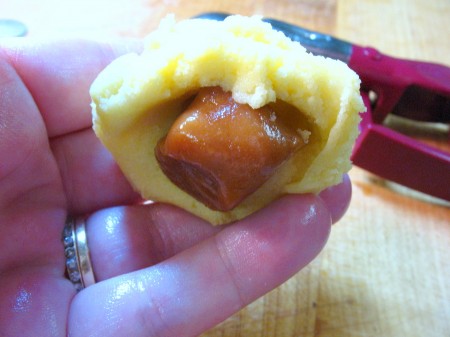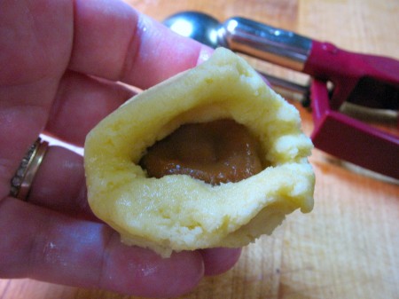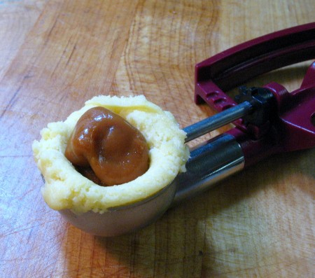Pop the dough out of the scoop and feel the bottom to ensure the caramel ball isn't coming out the other side.