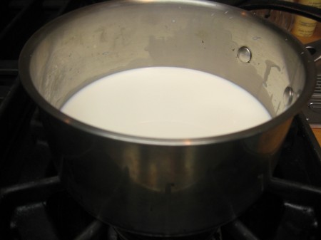 Over a burner at medium-high heat, bring 2 cups (454g) milk to a simmer.