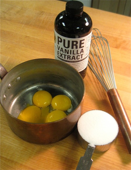 In a separate saucepan or bowl, whisk 4 large egg yolks, 1/2 cup (99g) granulated sugar, and 1/2 teaspoon King Arthur Pure Vanilla Extract.