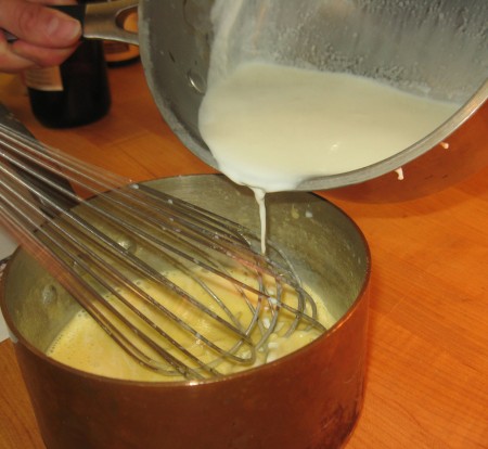 Beat briskly until you see the yellow of the yolks lighten in color and thicken to a ribbon consistency.