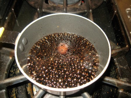 The longer the vinegar boils, the larger the bubbles become. This is due to there being more resistance as the vinegar reaches a higher viscosity. At 216°, the bubbles are close to the size of pencil-eraser heads. Bring the vinegar to a temperature of about 225°.