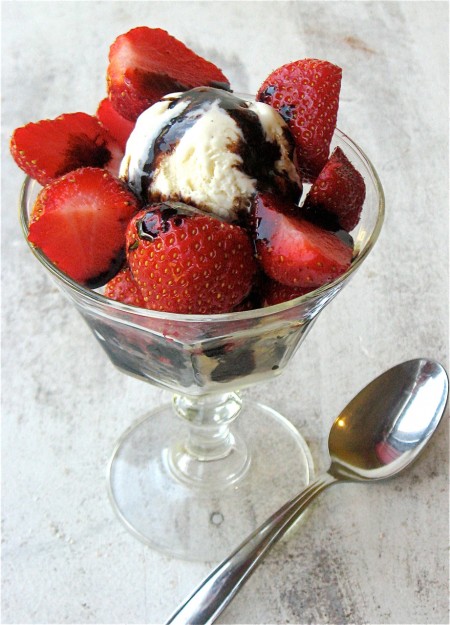 Immediately spoon about a tablespoon of this hot, lightly spiced reduction onto a few scoops of ice cream topped with 1/2 cup halved strawberries. Not only will you have an amazing experience of flavors, but you'll also have my favorite dessert contrast of hot and cold.