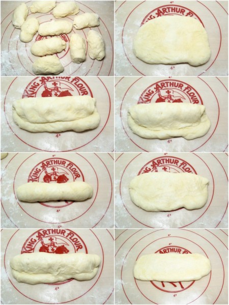 Working with one piece of dough at a time, flatten it, and fold it in half lengthwise, sealing the seam. Repeat: flatten, fold, and seal. (If you've ever shaped baguettes, this is the same technique.)