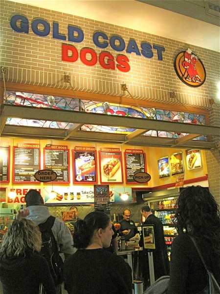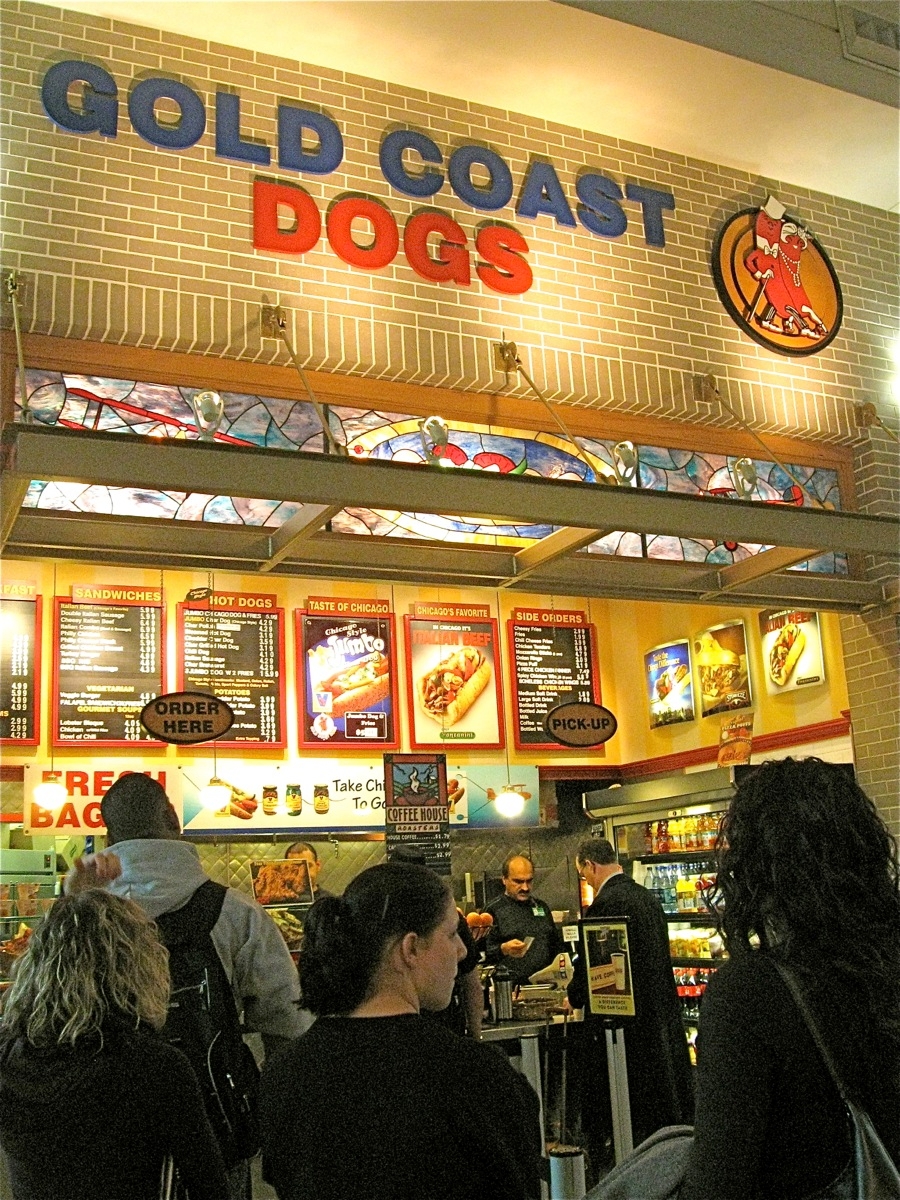 Midway Airport, outside downtown Chicago: the crowd gathers at Gold Coast Dogs, which I'm assured is a "real" Chicago hot dog chain – despite, in this case, being far from the Loop.