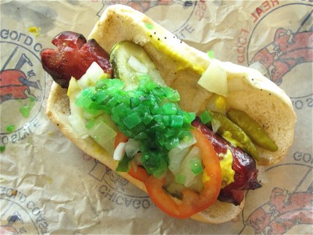 "Other vendors strayed off the trail somewhat, but in general a Chicago hot dog may have onions, sauerkraut, hot peppers, mustard, and the brightest neon green relish you've ever seen riding on top. Sometimes chili, sometimes cheese. Ketchup? Well, all right, if you really must; people in Chicago are way too polite to scoff at you, but you will have branded yourself a non-native at the least."