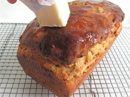 Remove the bread from the oven, and after a couple of minutes turn it out of the pan. Run a stick of butter over the top, if desired; this will yield a soft crust and, of course, wonderful, buttery flavor.