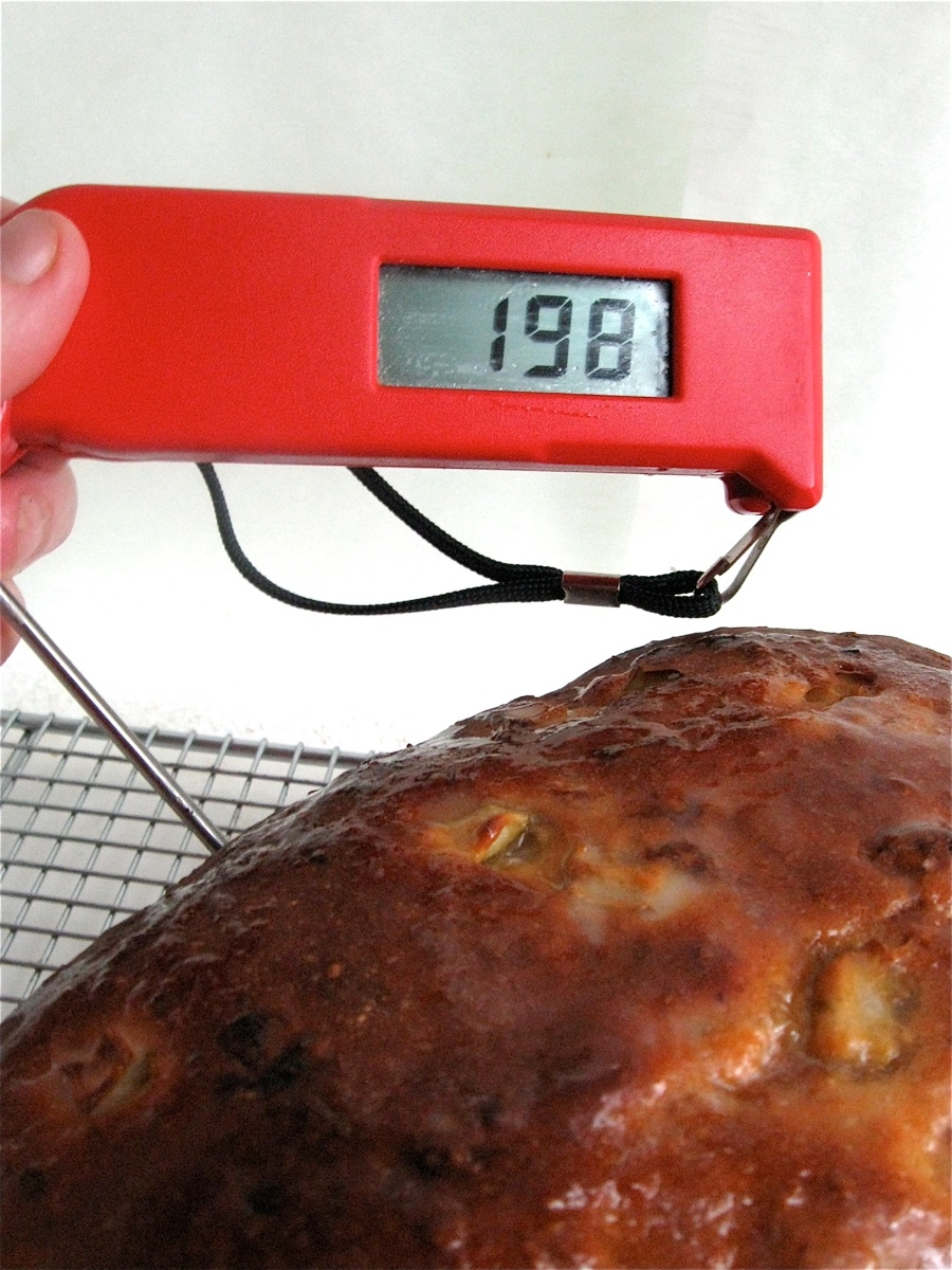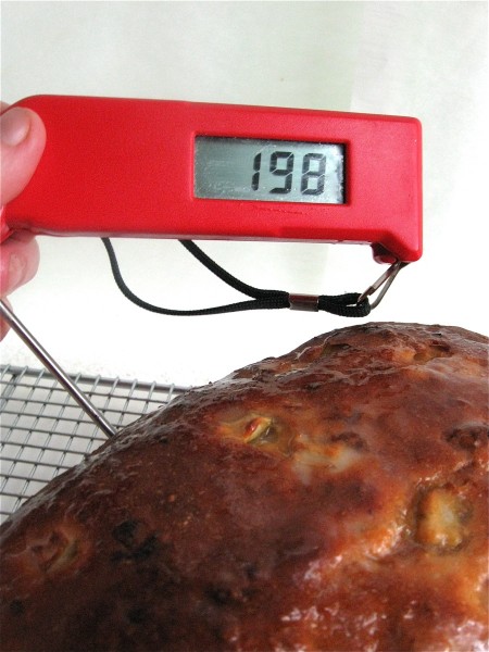 When it's done, the bread will be golden brown, and will register 190°F on an instant-read thermometer inserted into the center.