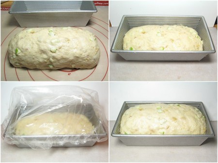 Gently deflate the risen dough, and shape it into a log. Place it in the pan, and cover it lightly.
