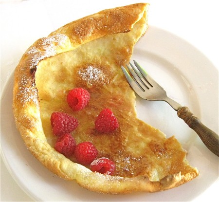 It’s delicious; it’s easy; and who cares if it settles back a bit from its glorious oven-fresh heights as it cools? Part popover, part crêpe, part pancake, it combines the best aspects of all three. We like to serve it on a lazy Sunday morning, garnished with fresh berries, Sunday paper (New York Times?) close at hand.